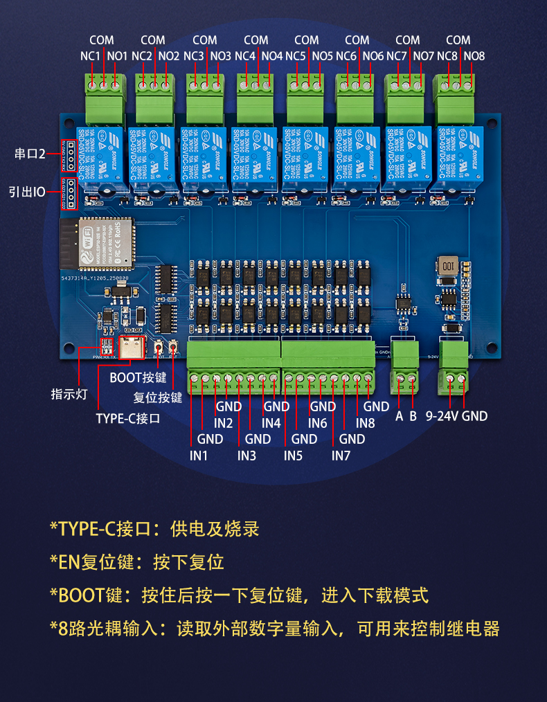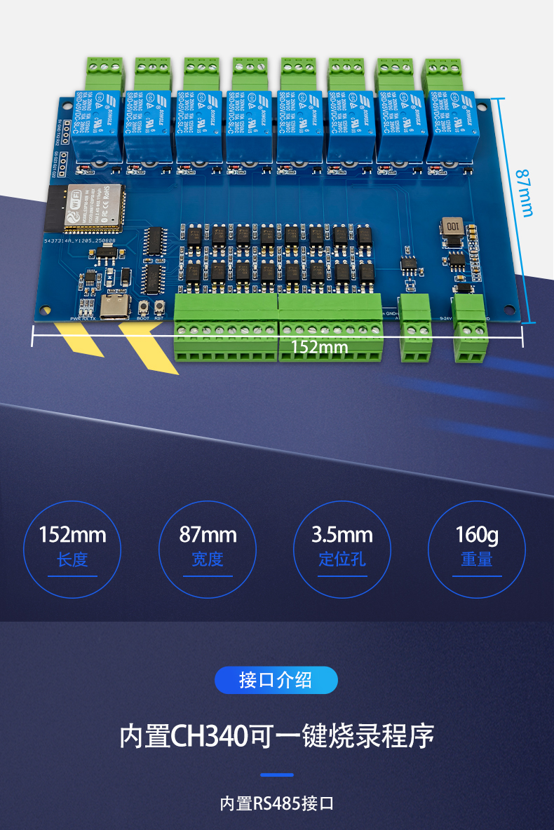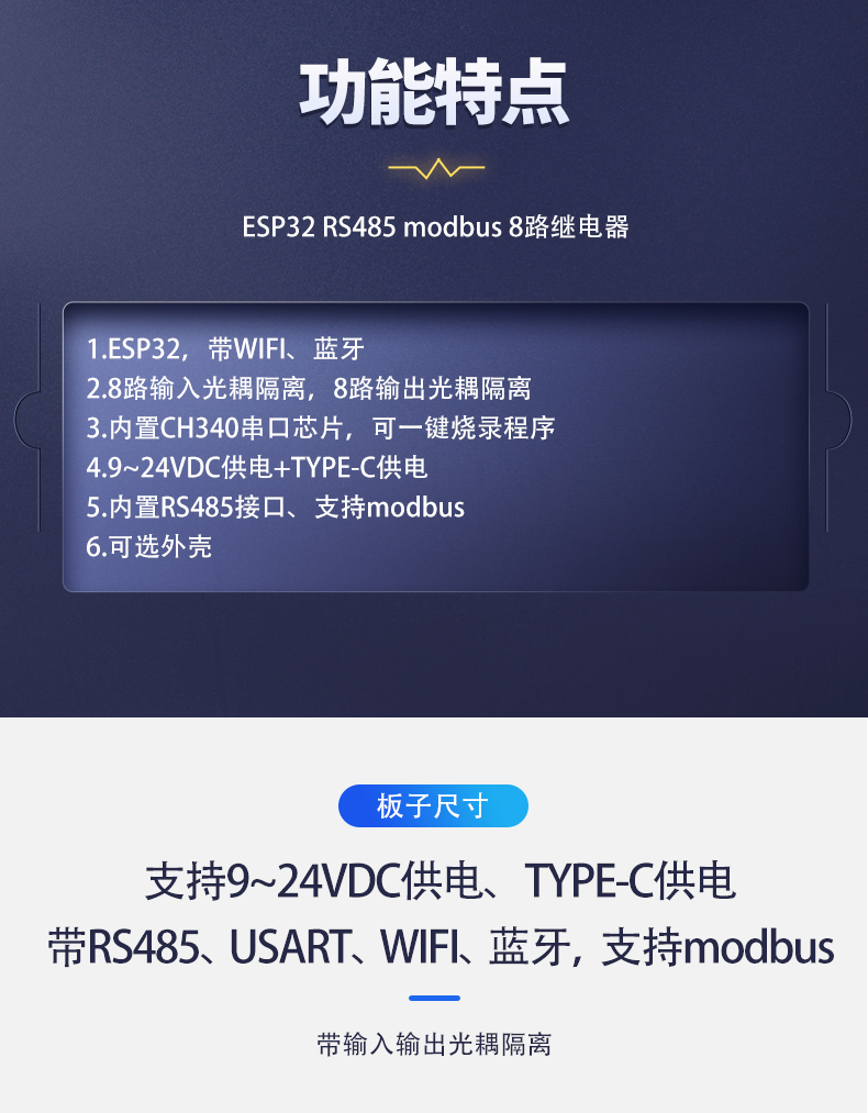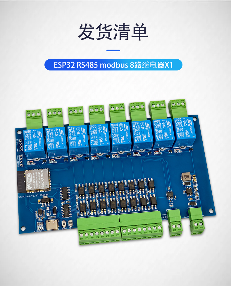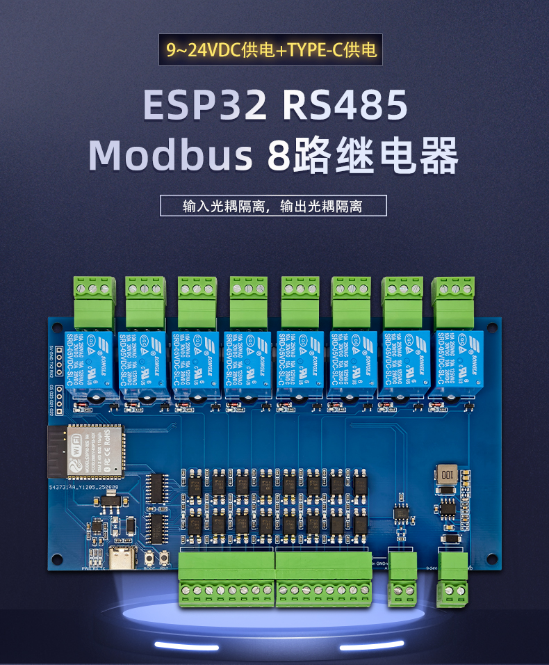 ESP32 Modbus八路继电器 RS485 8输入8输出光耦隔离 可选外壳